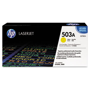 Main SpecificationsnProduct Description HP 503A – yellow – original – LaserJet – toner cartridge (Q7582A)nProduct Type Toner cartridgenPrinting Technology LasernHP Sub-brand LaserJetnPrinting Color YellownDuty Cycle Up to 6000 pages at 5% coveragenCompatible with Color LaserJet 3800, 3800dn, 3800dtn, 3800n, CP3505, CP3505dn, CP3505n, CP3505x